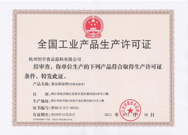 2011年12月26日,杭州恒宇食品原料公司取得浙江省质监局公布发的复配食品添加剂生产许可证。许可证编号为:浙XK13-217-00101,专业生产复配乳化增稠剂、复配乳化剂、复配增稠剂。